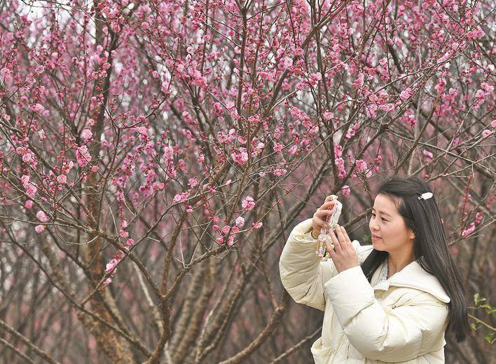 众多游客结伴而行,或漫步花间,拿出手机、相机定格下这早春的“梅”好瞬间,或坐在长椅上,晒着暖阳、聊着家常,任身旁的梅花香气萦绕,惬意十足。